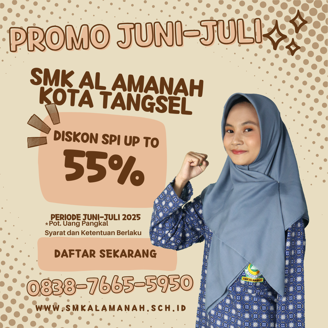 Dapatkan Promo Cashback Sumbangan Pengembangan Institusi/Uang Pangkal menarik hingga 50% khusus untuk lulusan SMP Al Amanah Kota Tangerang Selatan. Syarat & Ketentuan Berlaku.